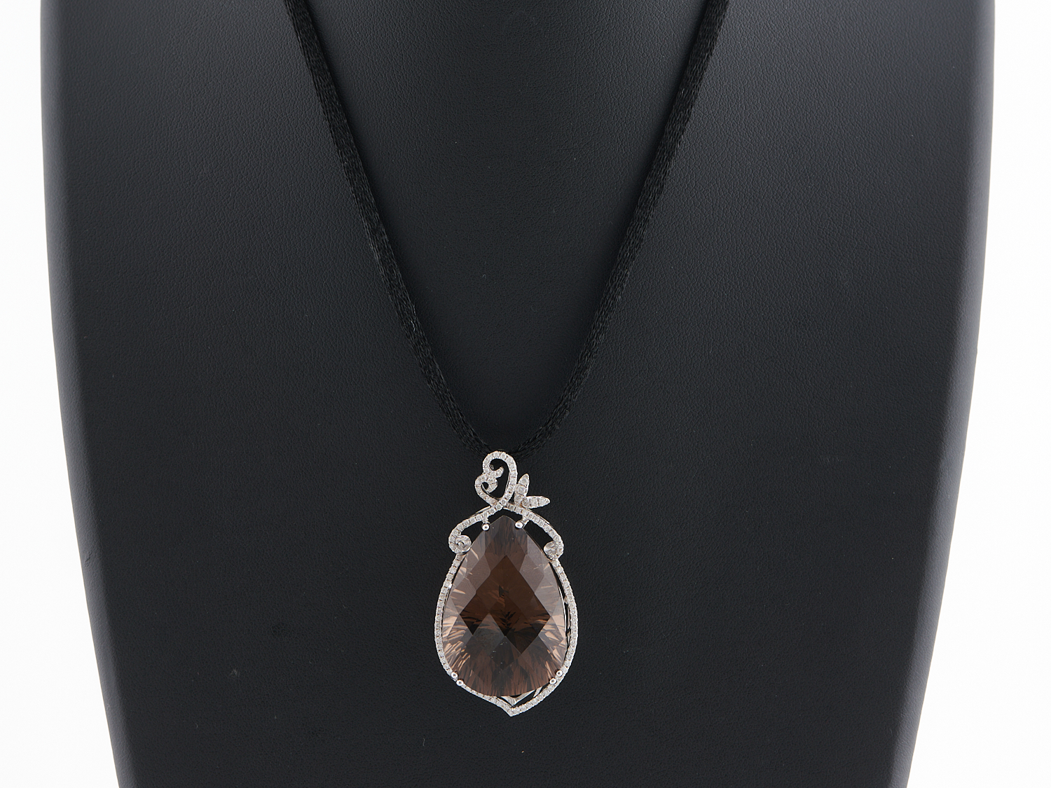 A SMOKEY QUARTZ AND DIAMOND PENDANT IN 18CT WHITE GOLD, THE QUARTZ WEIGHING 52.3CTS, THE DIAMONDS TOTALLING 0.65CTS, TO A SILK CORD NECKLACE, LENGTH 720 ADJUSTABLE