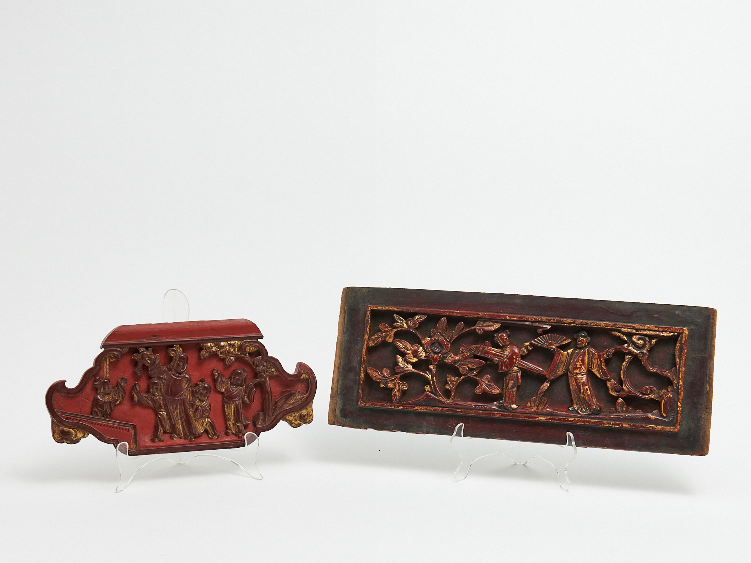 TWO CHINESE CARVED AND LACQUERED WALL APPLIQUES W.36CM (LARGEST), LEONARD JOEL LOCAL DELIVERY: SMALL