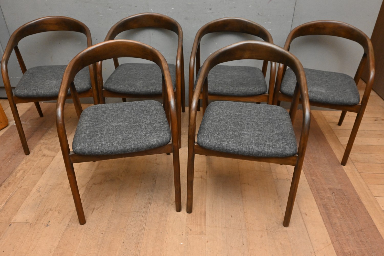 A SET OF SIX MID CENTURY STYLE CHAIRS IN WALNUT FINISH WITH NEWLY UPHOLSTERED SEATS ( 81H X 57W X 65D CM) (LEONARD JOEL DELIVERY SIZE: LARGE)