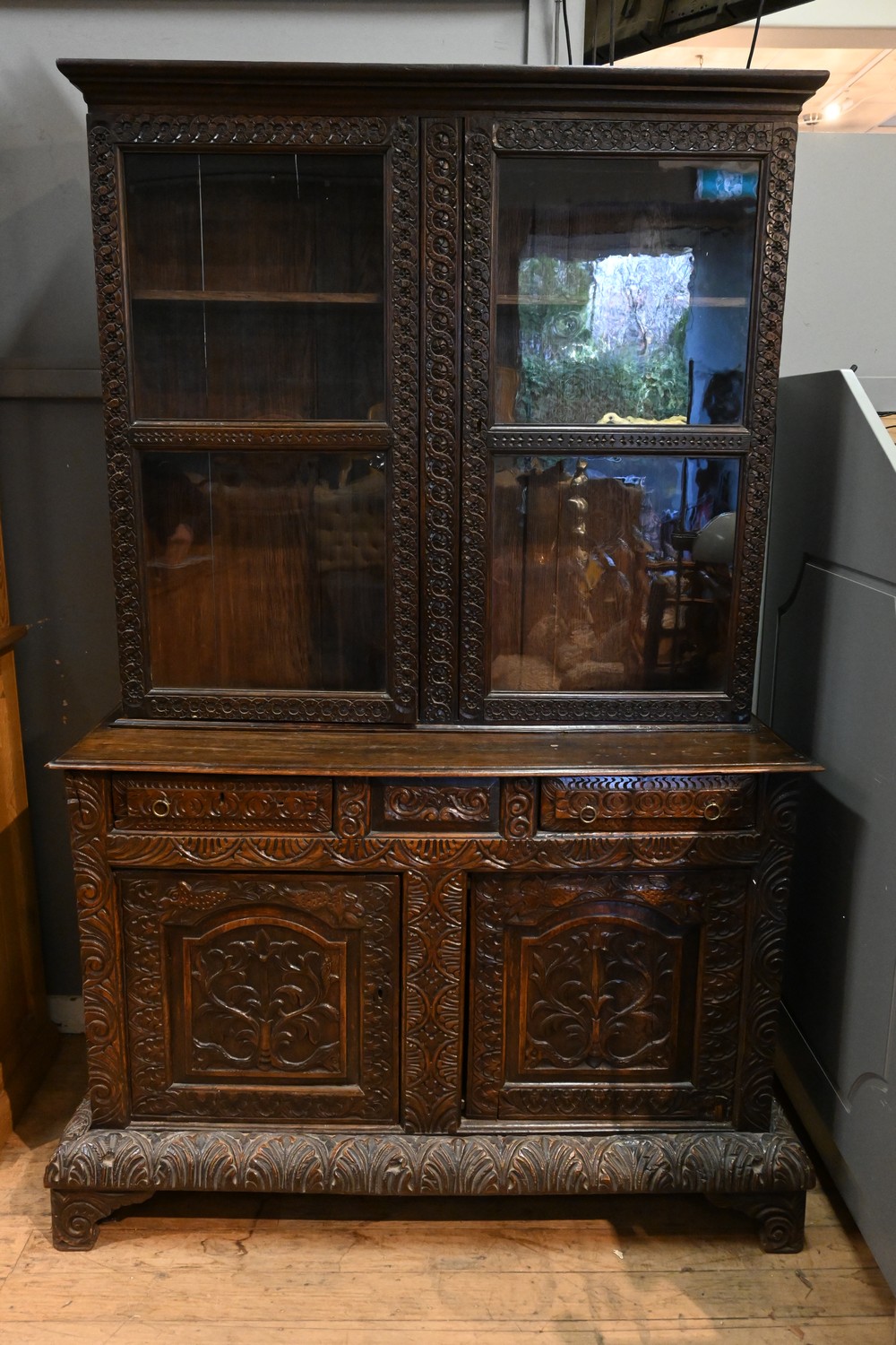 A CARVED AND STAINED OAK BOOK-CASE CABINET (A/F) ( 208H X 142W X 59D CM) (PLEASE NOTE THIS HEAVY ITEM MUST BE REMOVED BY CLIENTS OR CARRIERS AT THE CUSTOMERS EXPENSE. LEONARD JOEL STAFF CANNOT ASSIST CARRYING THIS ITEM)
