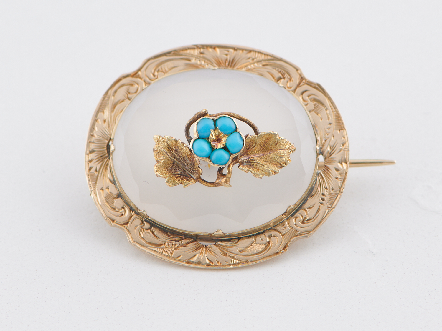 A VICTORIAN GOLD SET CHALCEDONY BROOCH, FEATURING TURQUOISE DETAIL, 24 X 21MM