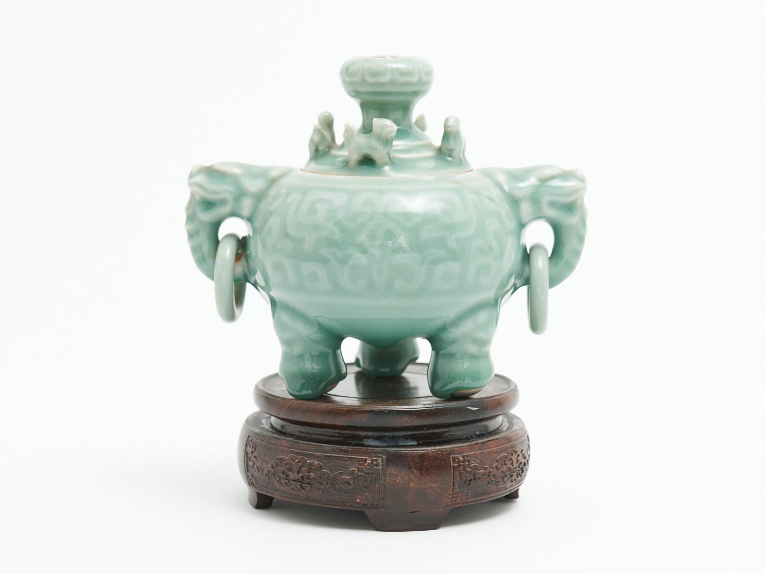 A CHINESE CELADON GLAZED LIDDED CENSOR ON CARVED ROSEWOOD BASE, H.13.5CM, LEONARD JOEL LOCAL DELIVERY: SMALL