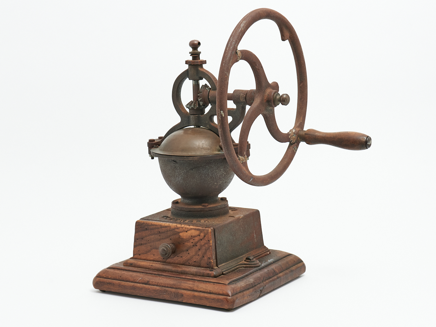 A CAST-IRON AND WOODEN BASED BRASS BARREL COFFEE GRINDER, H.47CM, LEONARD JOEL LOCAL DELIVERY: MEDIUM