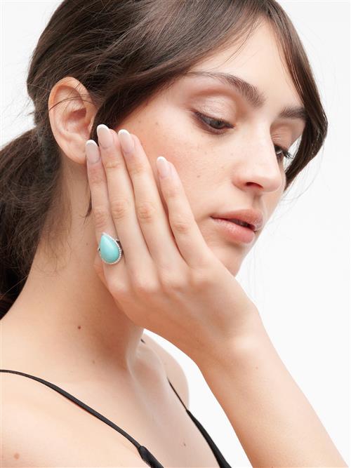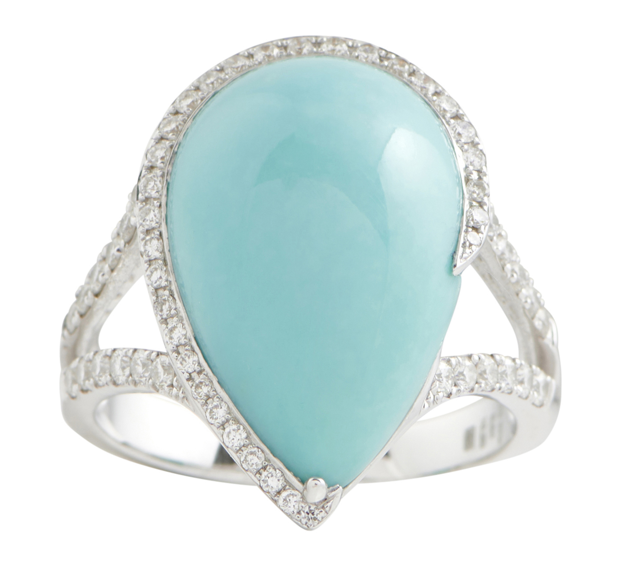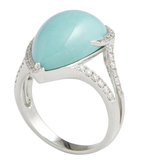 Centring a pear shaped turquoise cut en cabochon, within a decorative surround of brilliant-cut diamonds to split diamond set shoulders together weighing approximately 0.39 carats, signed HB for Hardy Brothers, size M, accompanied by Hardy Brothers box.