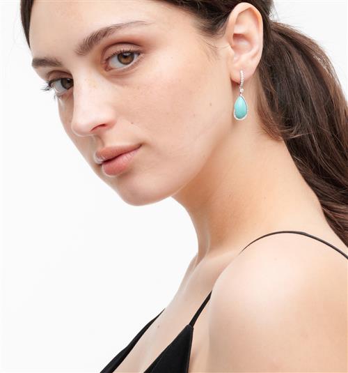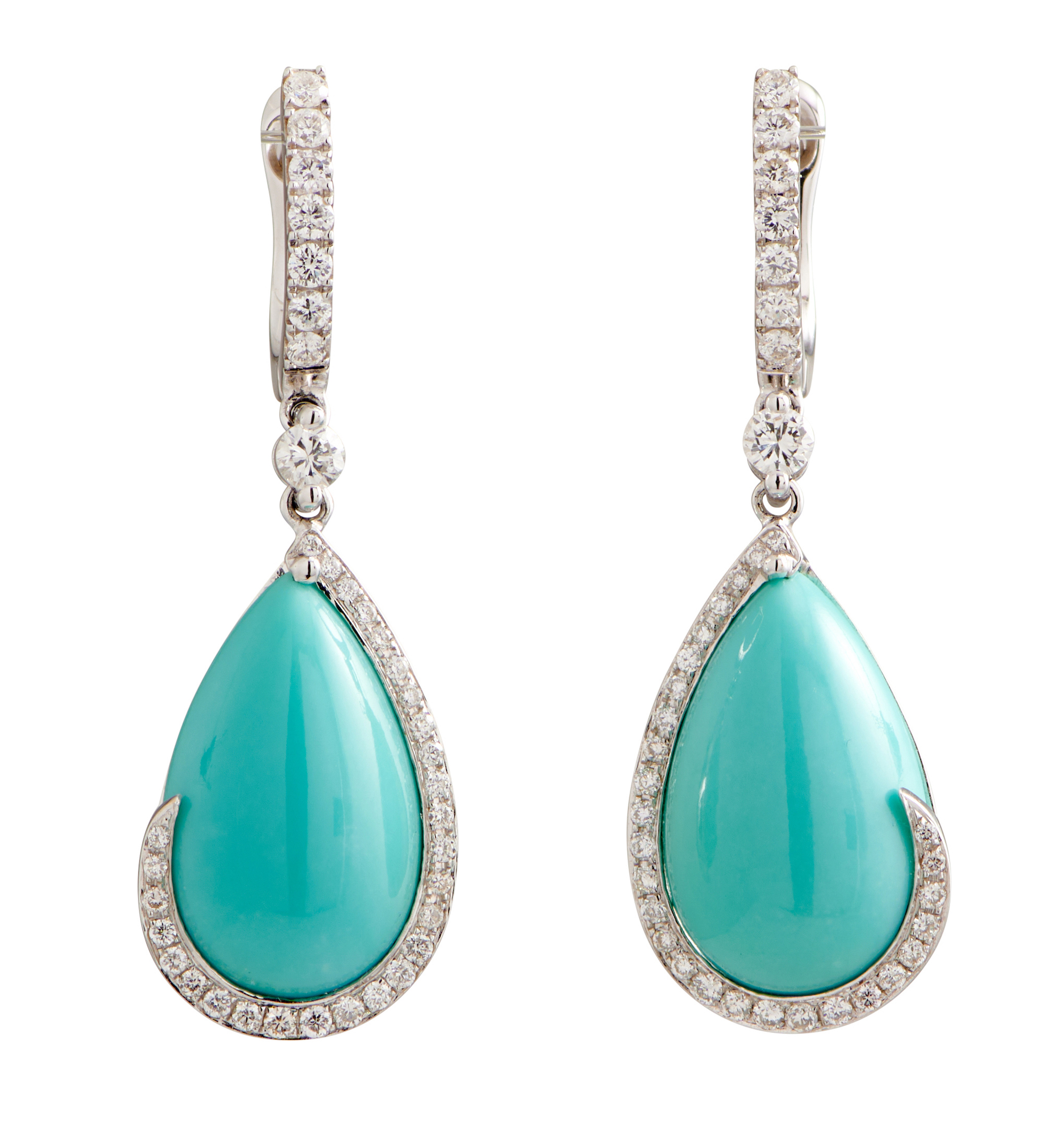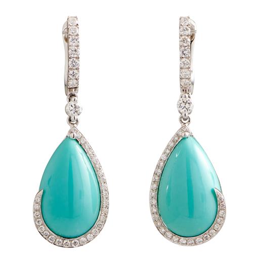 Each earring centring a pear shaped turquoise cut en cabochon, within a surround of brilliant-cut diamonds, suspended below a single diamond to a diamond set surmount, the diamonds together weighing approximately 0.50 carats, to European hook fittings, stamped HB for Hardy Brothers, length approximately 36mm, accompanied by Hardy Brothers box.