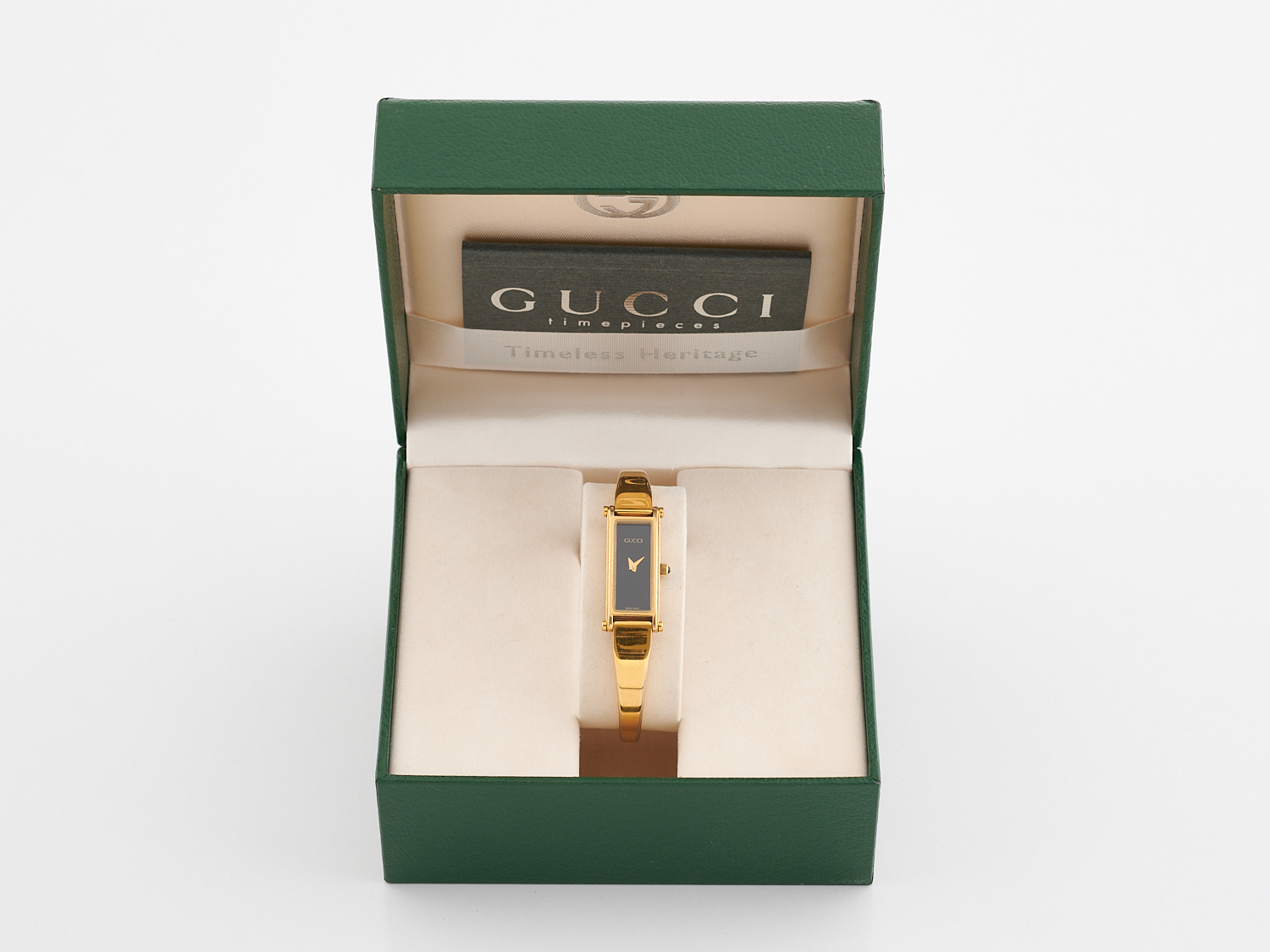 GUCCI, VINTAGE WRISTWATCH - Styled in gold tone metal, with rectangular black dial, quartz movement, boxed.