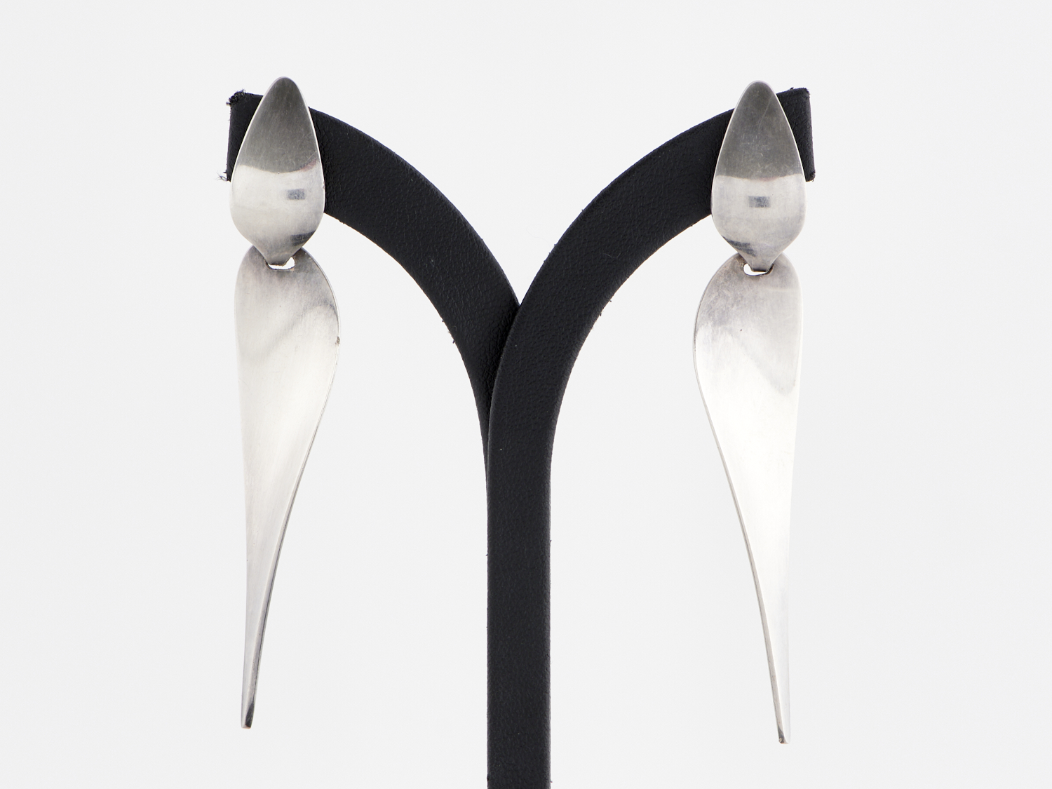 A PAIR OF EARRINGS IN SILVER TO SCREW BACK FITTINGS BY GEORG JENSEN, LENGTH 80MM, STYLE REF NO. 128A