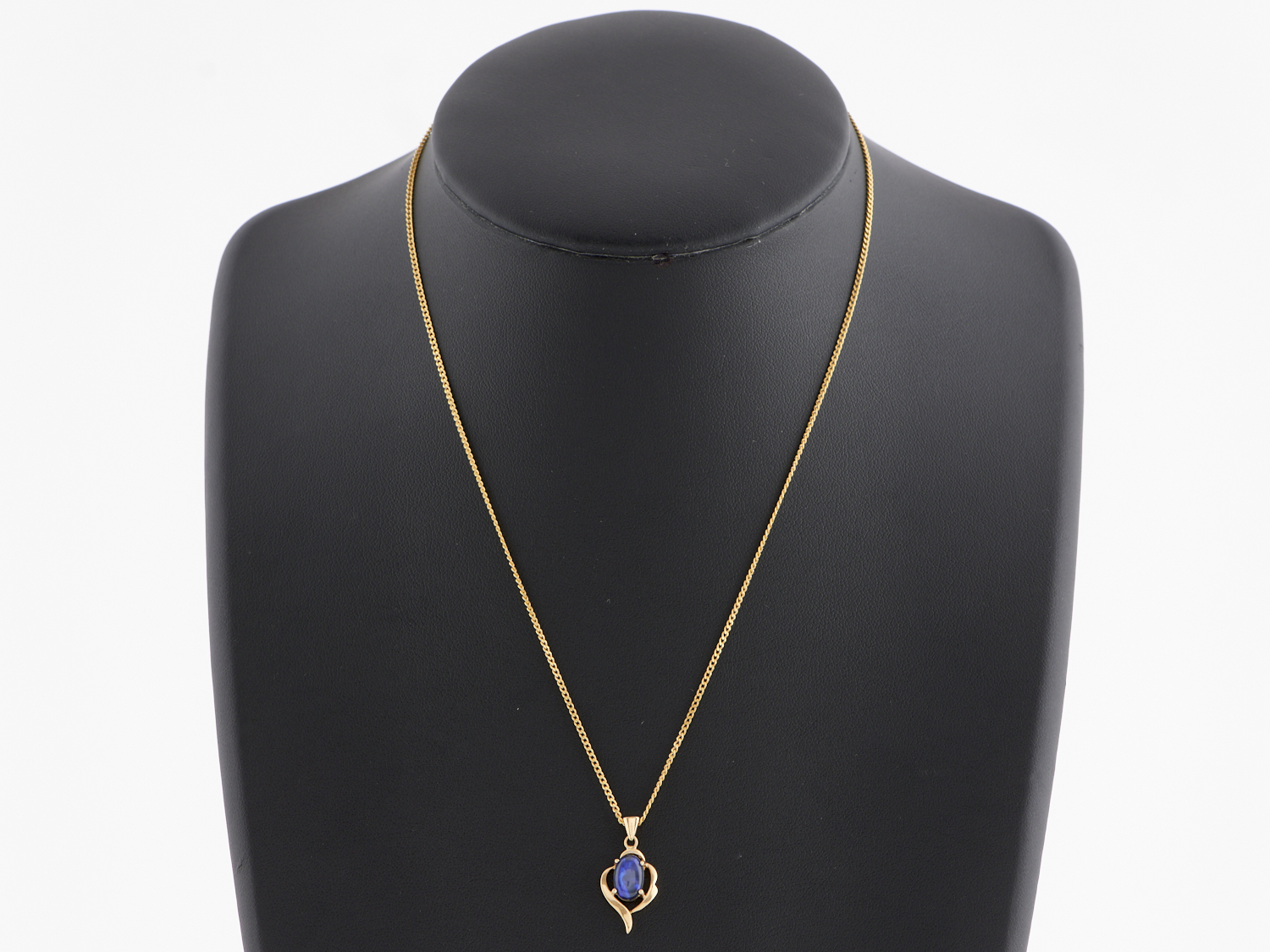 A BLACK OPAL PENDANT IN 18CT GOLD, 18 X 10MM, TO A CHAIN IN BASE METAL