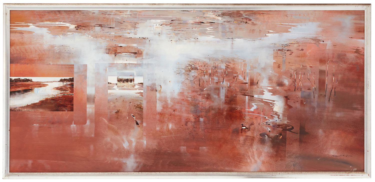 Overall areas of spiral cracking, two adhesions lower left corner, scratch lower right beside signature, stain to lower right edge, frame rusted (97 x 205cm framed)