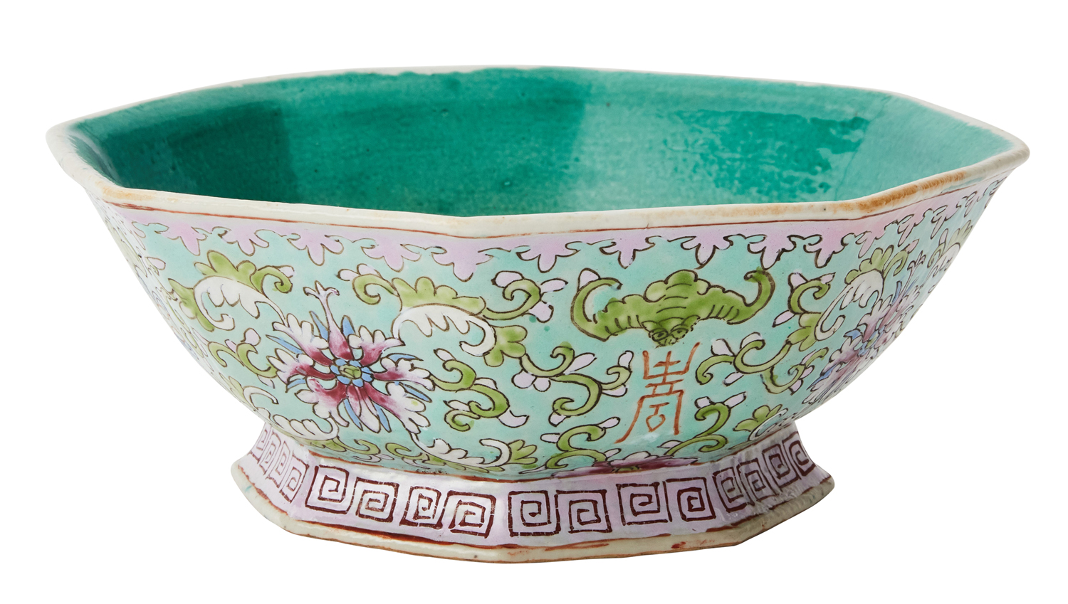 Painted in the famille rose manner with flowerheads, bats, shou characters and scrolling tendrils on a turquoise ground.