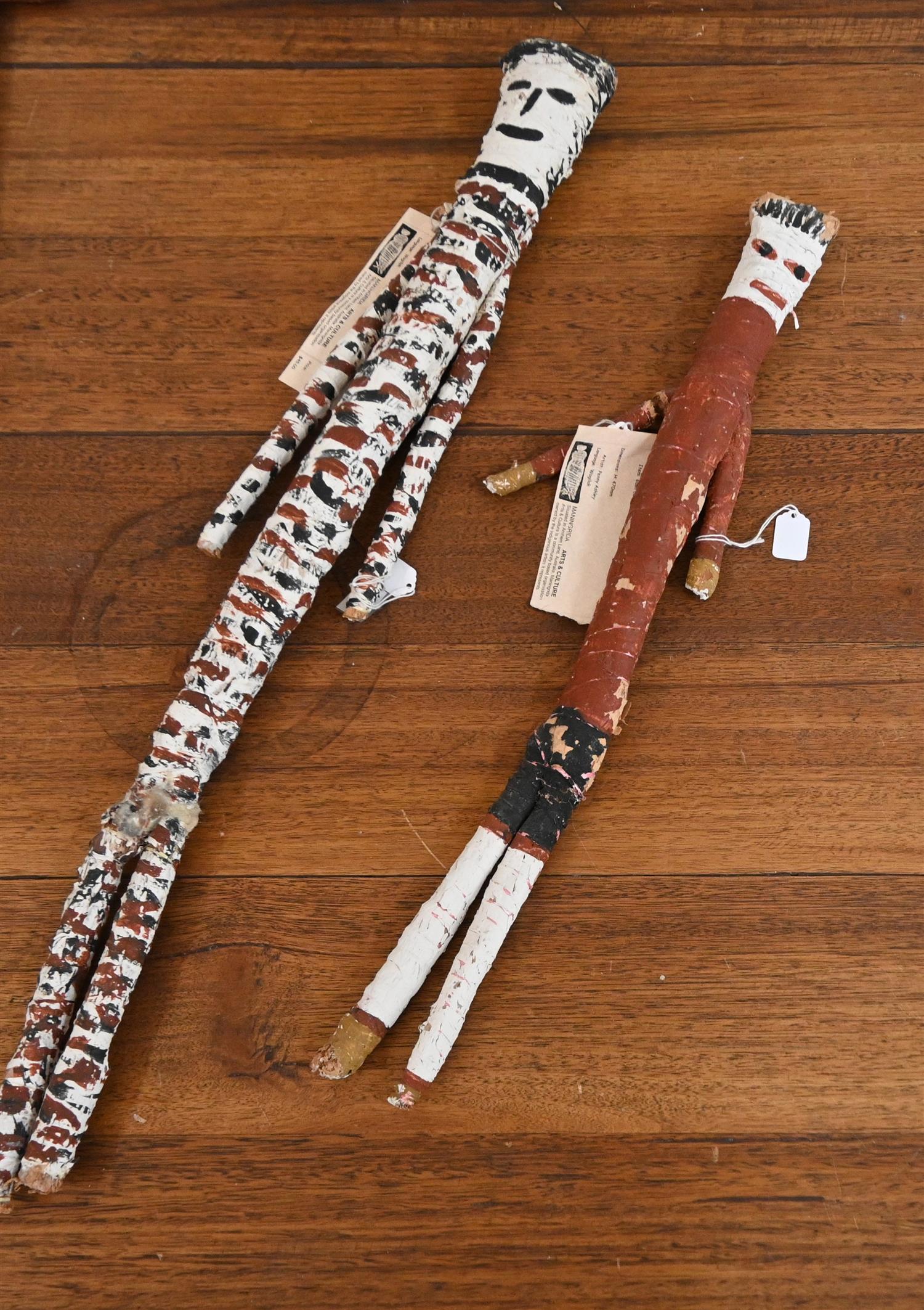 A large repair has been made to the lower half of the body of the larger bush doll. Glue is apparent on the outside of the figure. The lower portion of the figure remains unstable. The second bush doll shows a detached arm. There is a fair amount of cracking throughout both works, resulting in multiple areas of paint loss. Both works are fragile and should be handled with care.