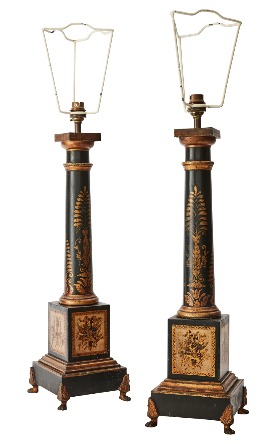 A PAIR OF EMPIRE STYLE TOLE PEINTE TABLE LAMPS