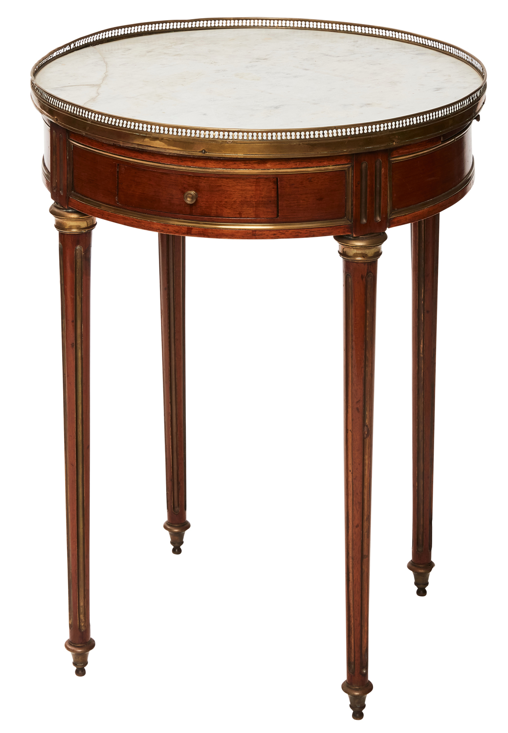The circular white marble top with brass gallery above two frieze drawers and two slides, on tapering fluted legs.