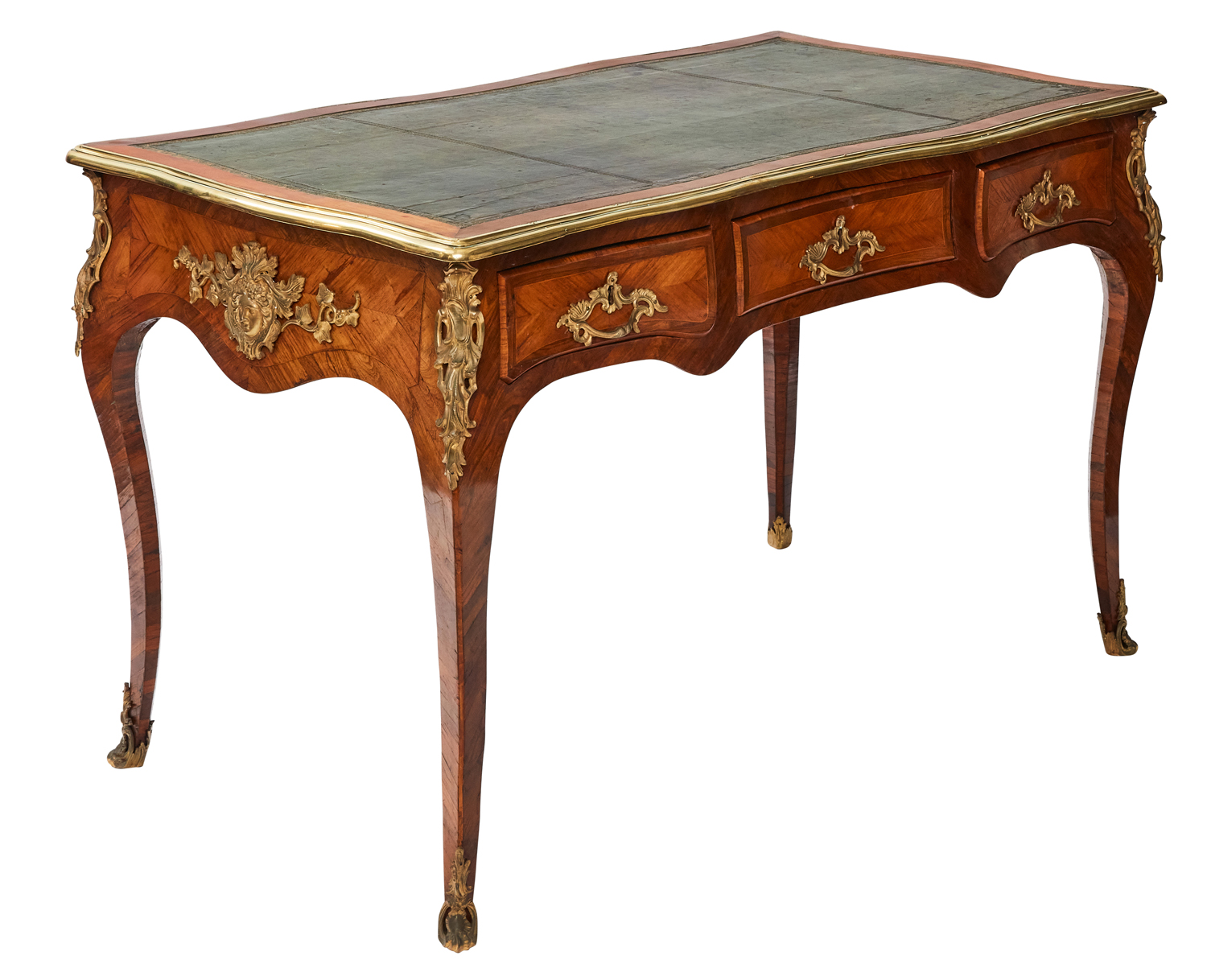 Of serpentine outline, the leather lined top with brass moulded edge above three real and three false frieze drawers quarter veneered in tulipwood, having rocaille chutes and sabots to the cabriole legs and espagnolette masks to the sides.