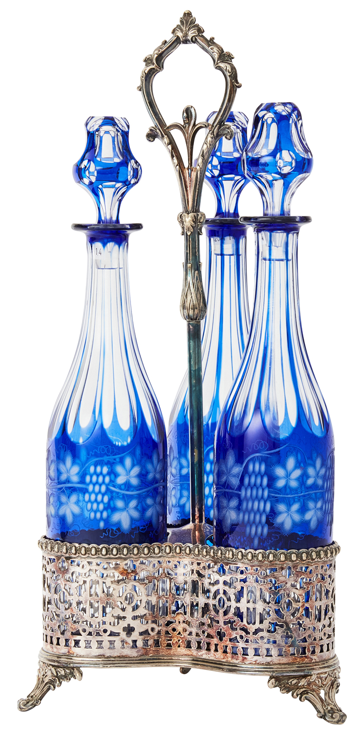 With pierced sides and scroll feet holding three blue overlay glass decanters cut with flutes and fruiting vines.