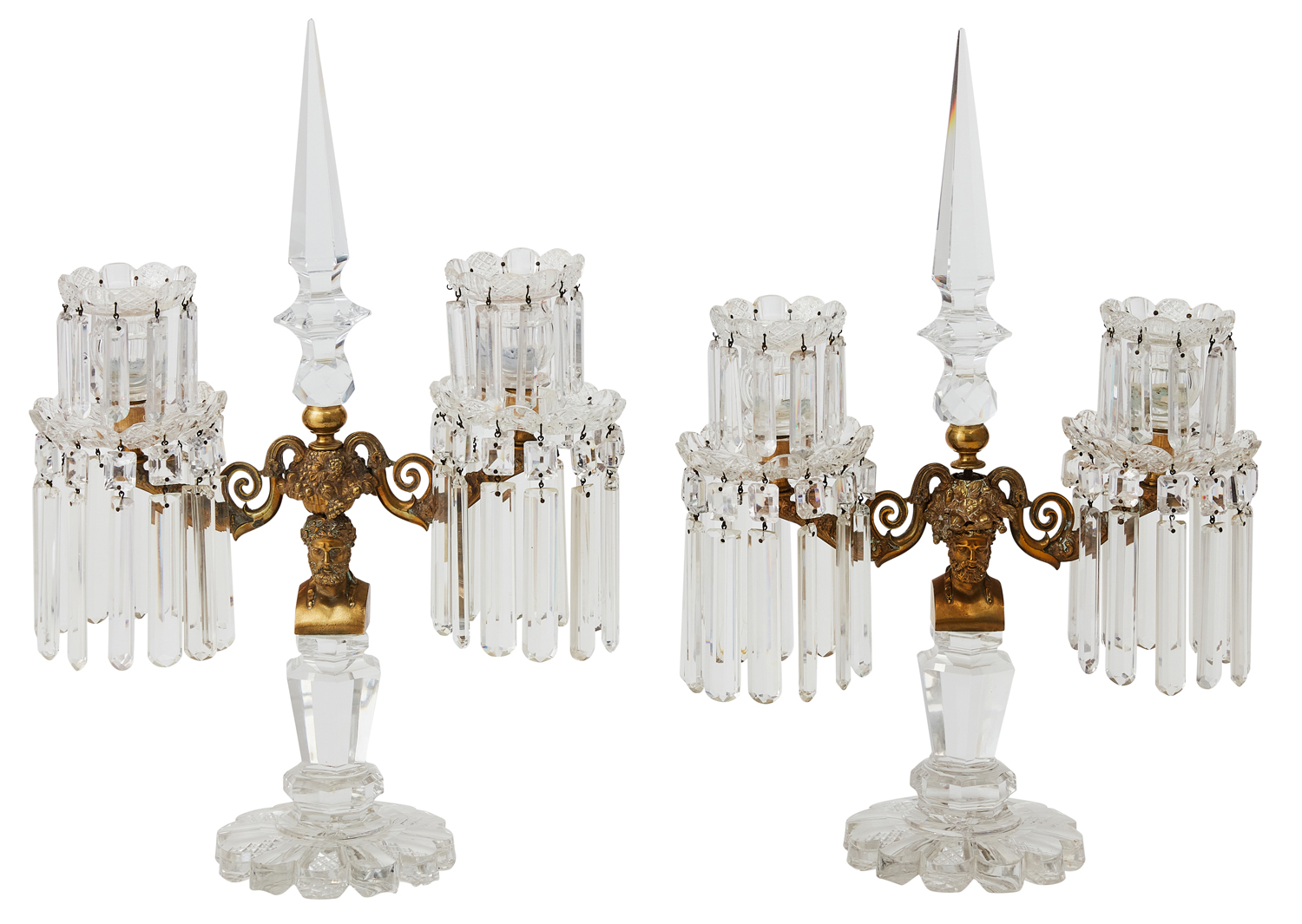 Each with the petalled base rising to a hexagonal shaft supporting a bearded bust issuing two scrolled arms from a fruiting vine basket and terminating in a spear finial, the two sconces hung with prism drops.
