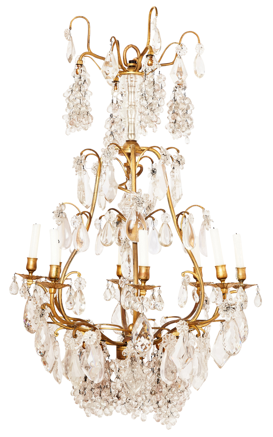 The scrolled cage hung with faceted prisms, bunches of grapes and teardrops, in original un-electrified state.