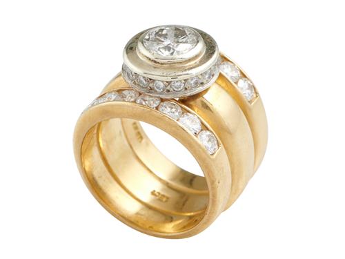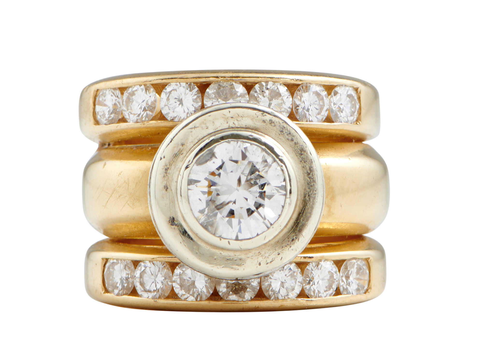 Comprising three fused bands, the middle band centring a collet-set brilliant-cut diamond weighing approximately 1.15 carats, with diamond set underbezel, the outer rings each channel-set with further brilliant-cut diamonds together weighing approximately 1.68 carats, size J-L.