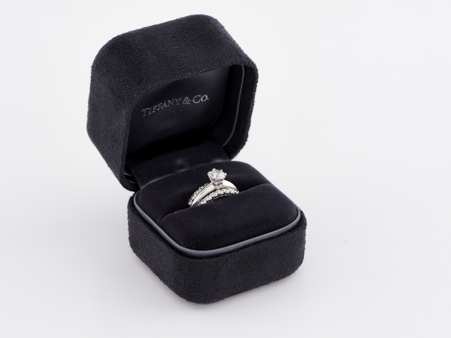 A TIFFANY & CO. DIAMOND SUITE IN PLATINUM, COMPRISING A SOLITAIRE DIAMOND RING WEIGHING 0.60CTS, AND TWO HALF HOOP DIAMOND BANDS, ACCOMPANIED BY A TIFFANY & CO. BOX AND CERTIFICATE NUMBER 19622258/F0217144 STATING THE 0.60CT DIAMOND IS F COLOUR, VVS1 CLARITY, RING SIZE L