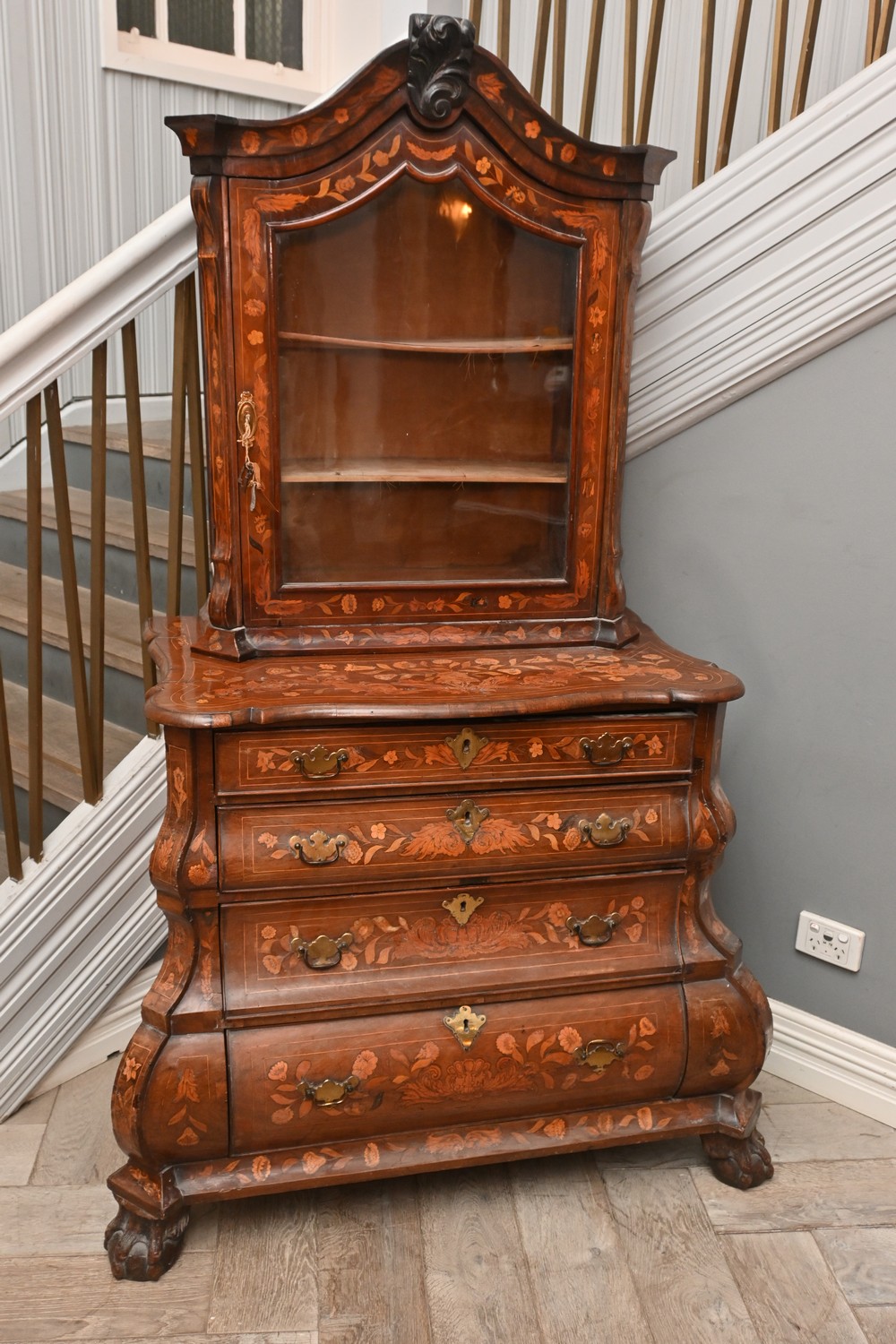 AN 18TH CENTURY DUTCH OAK LINED DOUBLE BODIED CABINET WITH INLAID TULIP DECORATION (175H X 88W X 70D CM) (PLEASE NOTE THIS HEAVY ITEM MUST BE REMOVED BY CLIENTS OR CARRIERS AT THE CUSTOMERS EXPENSE. LEONARD JOEL STAFF CANNOT ASSIST CARRYING THIS ITEM)