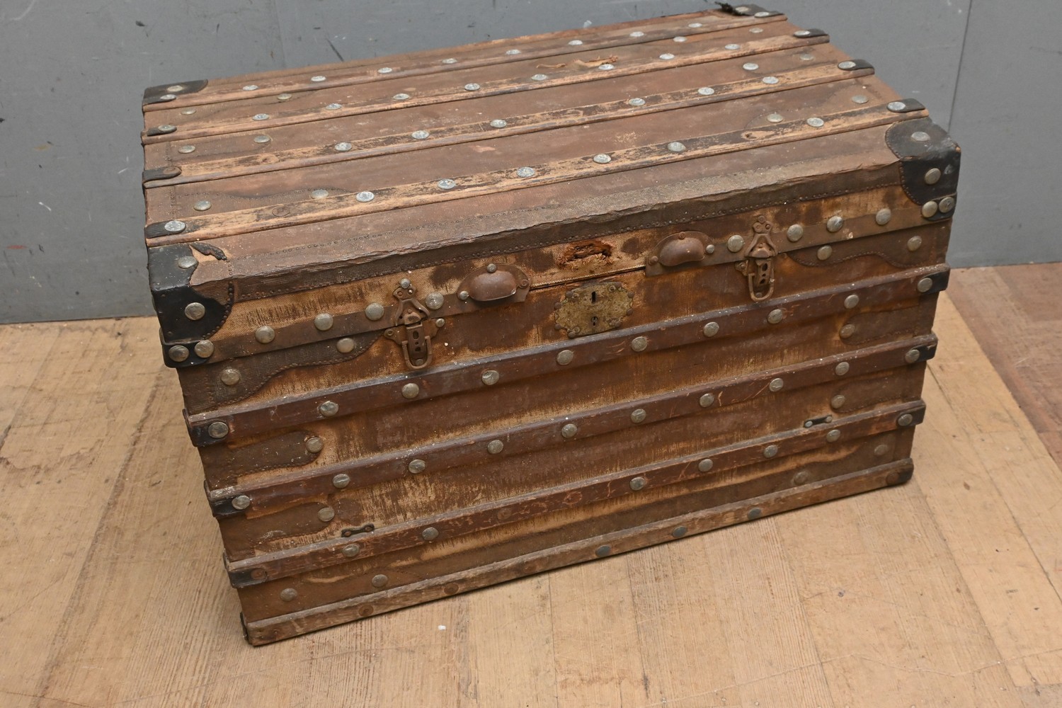 AN ANTIQUE LEATHER BOUND TRAVELLING TRUNK CIRCA EARLY 20TH CENTURY (A/F) (H57 X W94 X D60 CM) (LEONARD JOEL DELIVERY SIZE: EXTRA-LARGE)