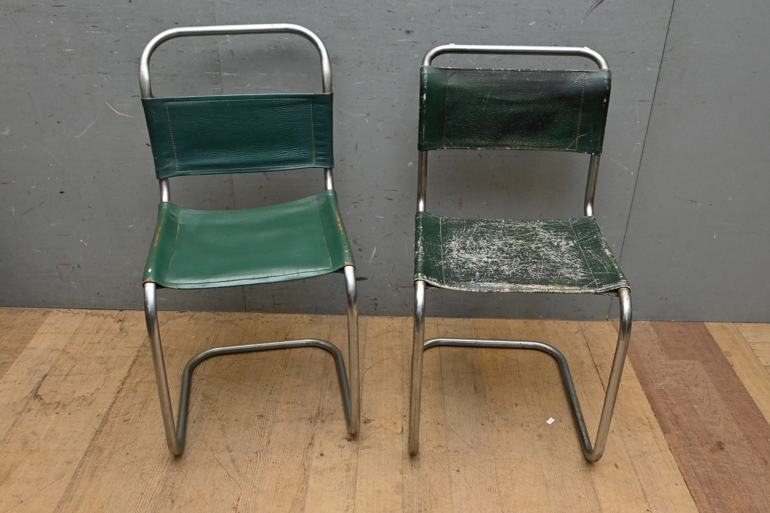 A PAIR OF MID CENTURY LEATHER AND CHROME CANTELEVER CHAIRS (A/F) (H88 X W43 X D54 CM) (LEONARD JOEL DELIVERY SIZE: LARGE)