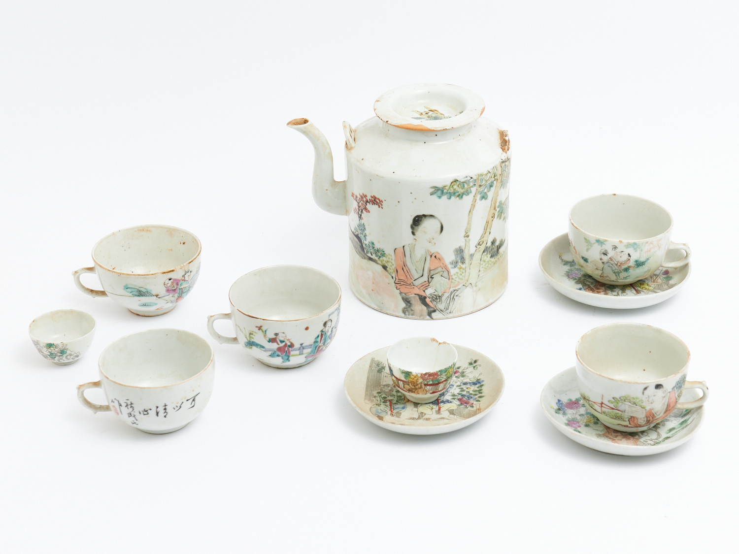 A CHINESE QINGJIANG CAI TEAPOT TOGETHER WITH CUPS, 19TH CENTURY (A/F), LEONARD JOEL LOCAL DELIVERY: MEDIUM