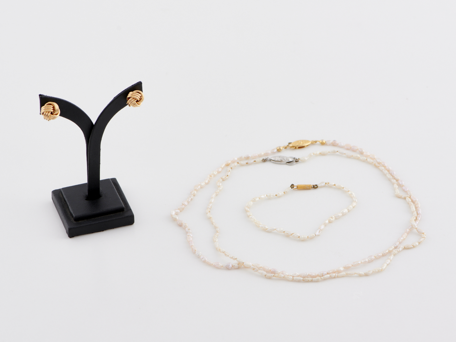 A PAIR OF KNOT EARRINGS IN 9CT GOLD, TO POST FITTINGS, ALONG WITH TWO FRESHWATER PEARL NECKLACES AND A FRESHWATER PEARL BRACELET