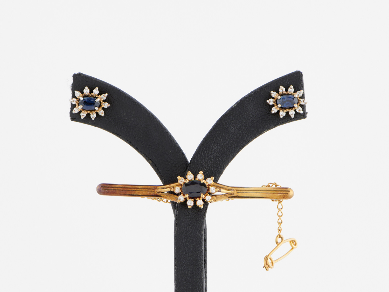 A SAPPHIRE AND DIAMOND BAR BROOCH IN 9CT GOLD TOGETHER WITH A PAIR OF CONFORMING CLUSTER EARRINGS, TO POST FITTINGS, TOTAL WEIGHT 5.91GMS