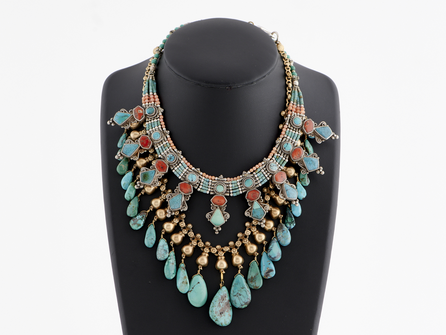 TWO ETHNIC SILVER TURQUOISE AND CORLA FRINGED NECKLACES