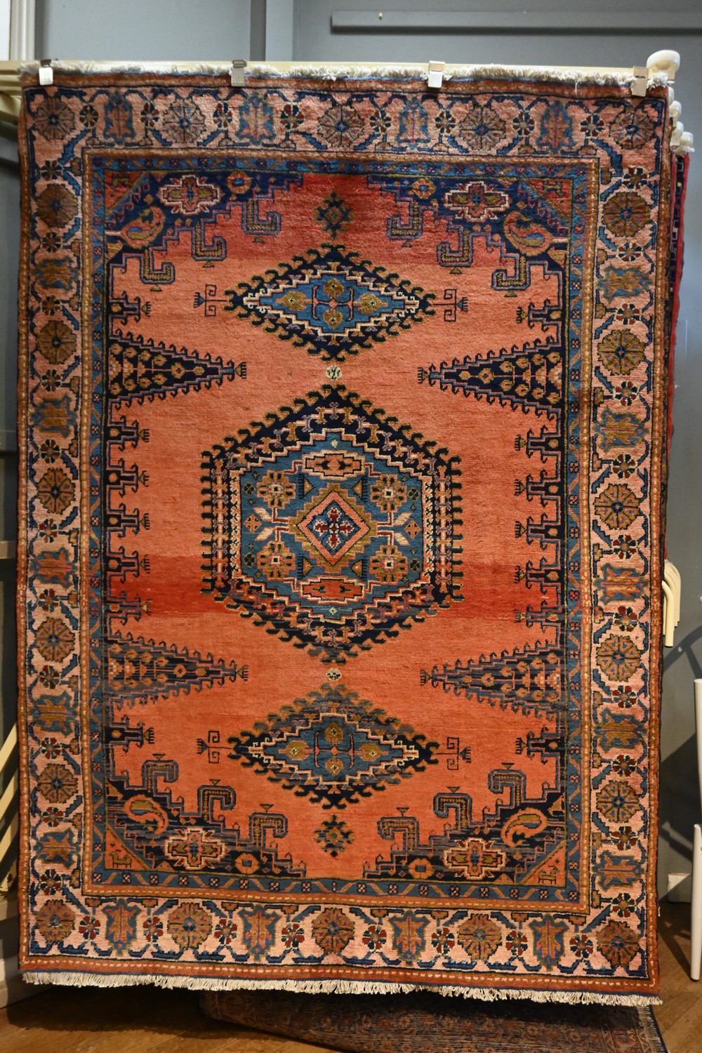 A PERSIAN TRIBAL VISS RUG - CAUCASIAN INFLUENCED, 100% WOOL, NATURAL DYES. HAND-KNOTTED VILLAGE WEAVE FROM THE ARAK REGION WITH TRIBAL DESIGN OF TRIPLE MEDALLIONS IN A VIBRANT BLUE TONE ON A SOFT RED FIELD. WITH UNIQUE CORNER GEOMETRIC MEDALLIONS IN INDIGO BLUE CONTAINING A SINGLE PAISLEY MOTIF. BORDER OF ROSETTES ON A SOFT ROSE FIELD. SIZE: 227 X 164 CM- ORIGIN: PERSIA- RRP: $2,400 DOCUMENTATION OF AUTHENTICITY INCLUDED