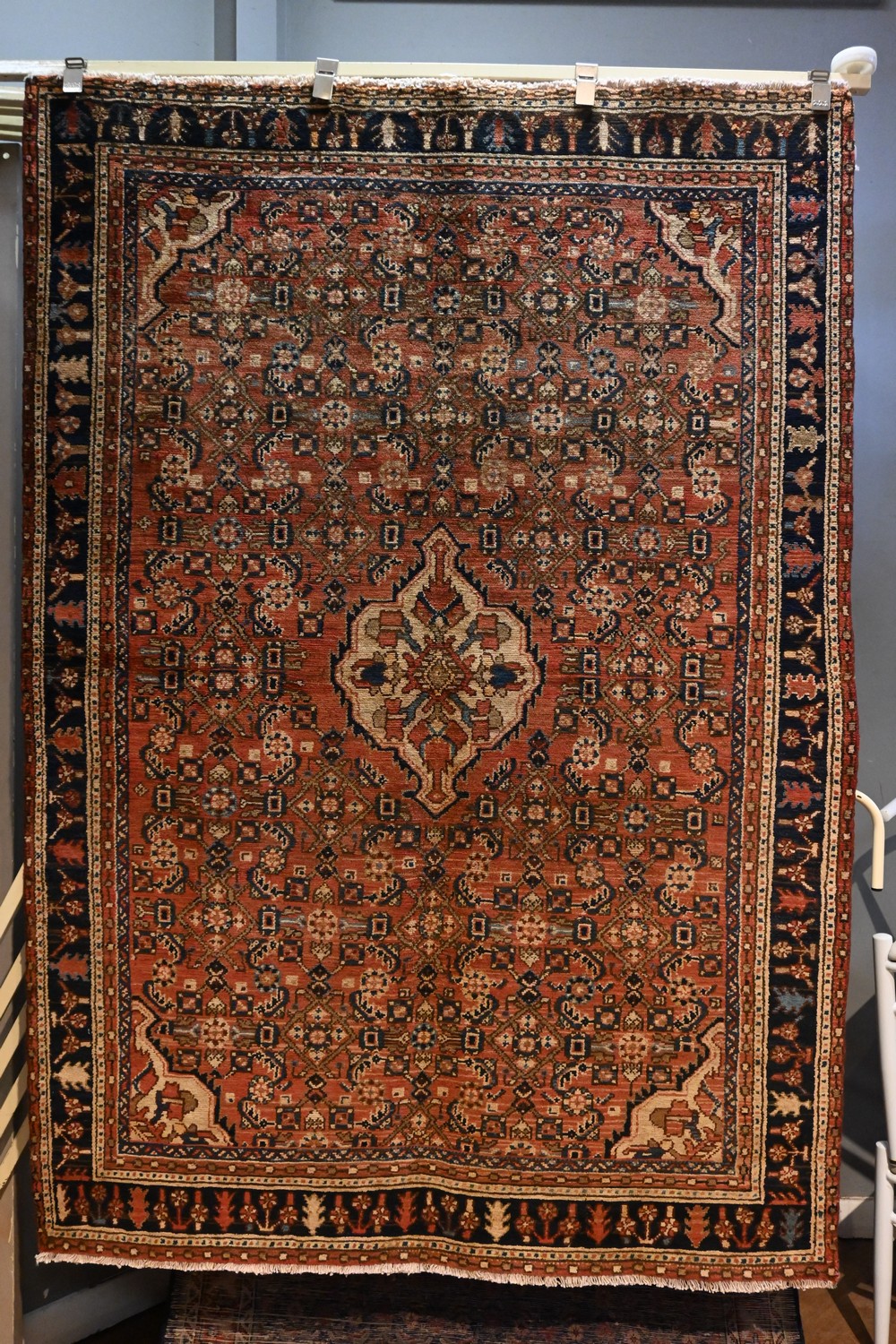 A PERSIAN ENJELAS IN MELLOW COLOURS, 100% WOOL & NATURAL DYES. HAND-KNOTTED VILLAGE WEAVE WITH TRIBAL DESIGN OF A FLORAL MEDALLION IN A FIELD OF HERATI MAHI PATTERNS. BORDER OF TREE AND FLORAL DESIGNS. SIZE: 207 X 146 CM ORIGIN: PERSIA - RRP: $2,200 DOCUMENTATION OF AUTHENTICITY INCLUDED