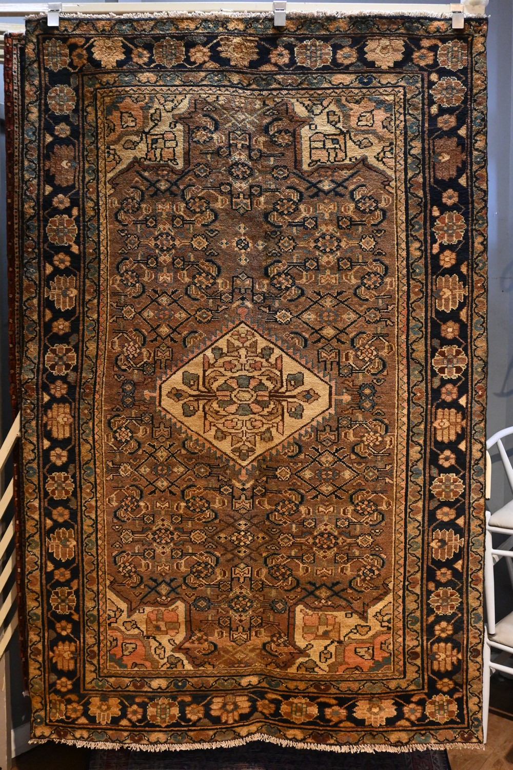 A PERSIAN BORCHALU RUG, CIRCA 1960'S 100% WOOL & NATURAL DYES, VINTAGE PILE. HAND-KNOTTED WITH A CENTRAL FLORAL MEDALLION AND CORNER MEDALLIONS IN SOFT MELLOW TONES. ALL OVER HERATI MOTIFS. BORDER OF INK BLUE WITH ROSETTES. SIZE: 215 X 138 CM ORIGIN: PERSIA - RRP: $2,100 DOCUMENTATION OF AUTHENTICITY INCLUDED
