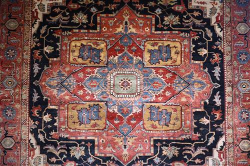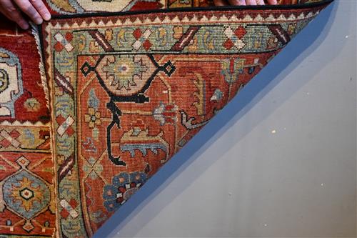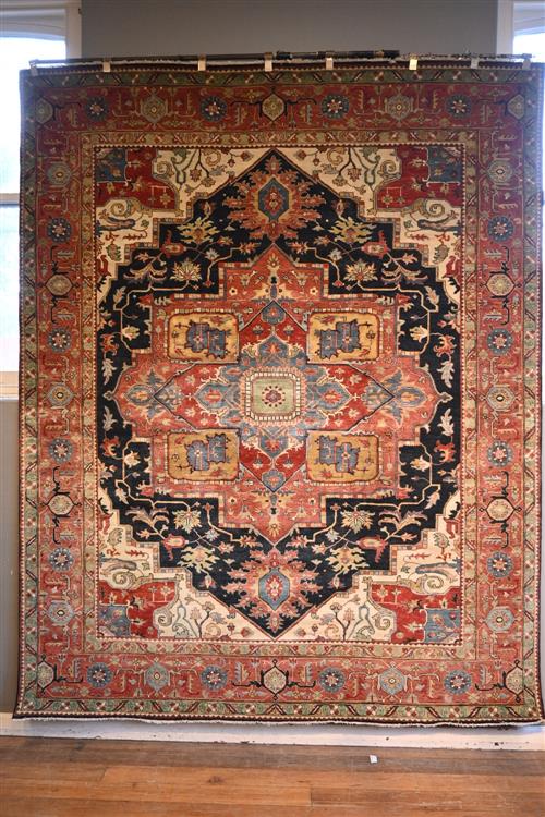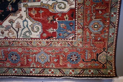 A MOST ATTRACTIVE PERSIAN SERAPI HERIZ DESIGN, VERY FINELY HAND-KNOTTED WITH THE FINEST HAND SPUN WOOL AND NATURAL DYES, NEW GALLERY CARPET BEING OFFERED. THE CARPET IS PERFECTLY BALANCED IN COLOUR & DESIGN IN TONES OF RUST, SEA GREEN, LIGHT BLUE & INDIGO BLUE & GOLD. CENTRED WITH A SOFT BLUE MEDALLION. EXTREMELY HARD WEARING, IN PRISTINE NEW CONDITION AN ABSOLUTE DESIRABLE CARPET FOR ALL SETTINGS. SIZE: 303 X 244 CM RRP $8,700 ORIGIN: AGRA TAJ MAHAL PROVINCE DOCUMENTATION OF AUTHENTICITY INCLUDED.
