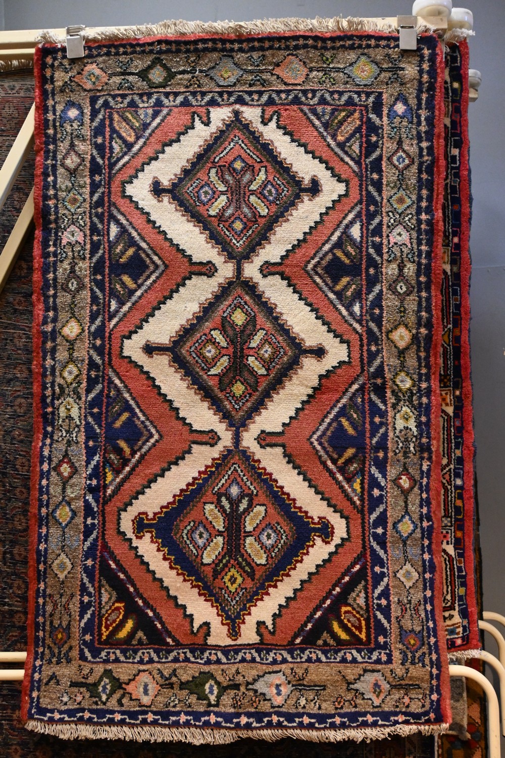 A PERSIAN ZAGEH RUG, 100% WOOL, NATURAL DYES. CONTINUING DIAMOND SHAPED MEDALLIONS IN AN OPEN POMEGRANATE RED FIELD. BORDER OF GEOMETRIC DESIGNS. SIZE: 130 X 78 CM ORIGIN: IRAN - RRP: $490 DOCUMENTATION OF AUTHENTICITY INCLUDED