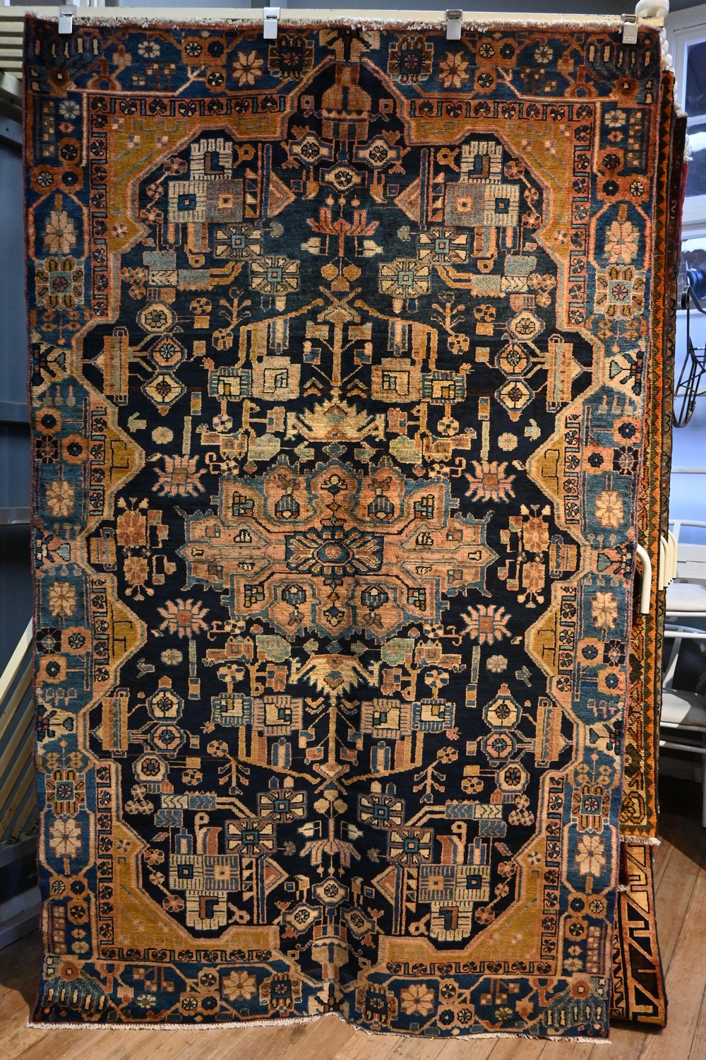 A MAGNIFICENT CIRCA 1960s TRIBAL PERSIAN NAHAVAND RUG. 100% HAND SPUN WOOL, NATURAL DYES, VINTAGE PILE. FINELY HAND-KNOTTED VILLAGE WEAVE WITH A DESIGN OF CENTRAL MEDALLION SET WITHIN A FIELD OF VARYING TRIBAL AND GEOMETRIC MOTIFS ON A CHARCOAL FIELD. UNIQUE BORDER OF GEOMETRIC AND FLORAL PATTERNS. RESTORED TO GALLERY CONDITION. SIZE: 250 X 156 CM ORIGIN: PERSIA - RRP: $2,700 DOCUMENTATION OF AUTHENTICITY INCLUDED.