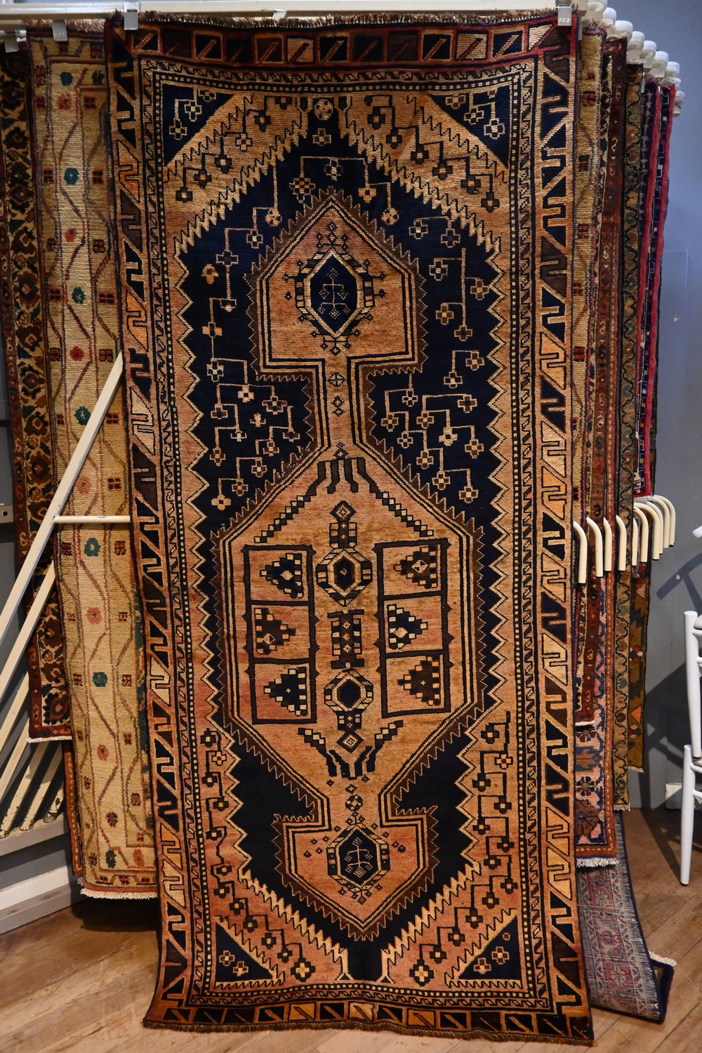 A FABULOUS CIRCA 1970s TRIBAL PERSIAN LURI RUG. 100% WOOL FOUNDATION, NATURAL DYES. VINTAGE PILE. HAND-KNOTTED TRIBAL WEAVE WITH A DESIGN OF A GEOMETRIC ANCHORED MEDALLION IN A SOFT BURNT ORANGE WITH GEOMETRIC PATTERNS ON A DEEP BLUE BACKGROUND OF TREE OF LIFE DESIGNS. BORDER OF GEOMETRIC MOTIFS. SOME NATURAL ABRASH. SIZE: 258 X 115 CM -RRP $2,600 - ORIGIN: PERSIA DOCUMENTATION OF AUTHENTICITY INCLUDED.