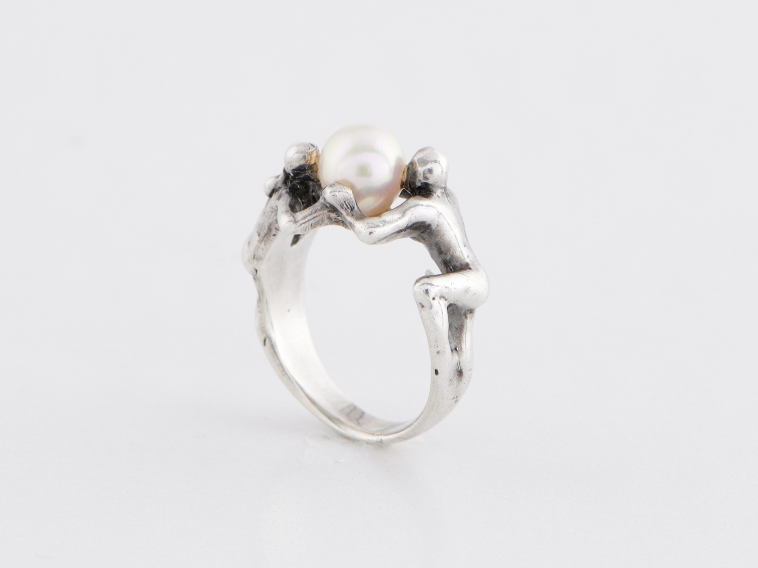 A MODERNIST CULTURED PEARL RING IN STERLING SILVER, APPROXIMATE RING SIZE L, APPROXIMATE WEIGHT 5.78GMS