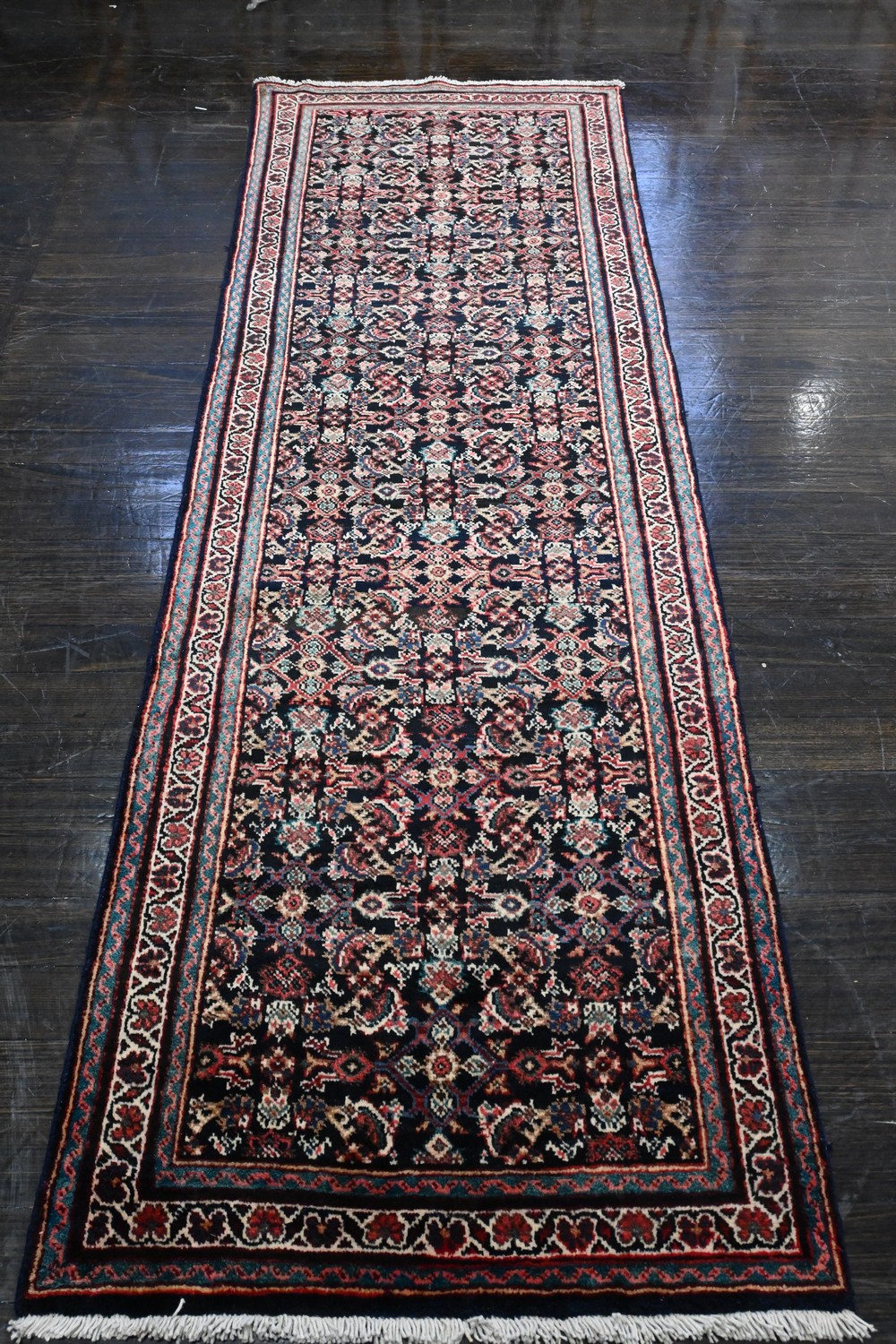A PERSIAN MAHALAT HALL RUNNER. 100% WOOL, PLUSH PILE. TRIBAL DESIGN OF ALL OVER HERATI PATTERNS ON A CHARCOAL FIELD. BORDER OF MINI ROSETTES. ORIGIN: PERSIA - RRP: $2,300- SIZE: 313 X 107 CM DOCUMENTATION OF AUTHENTICITY INCLUDED.