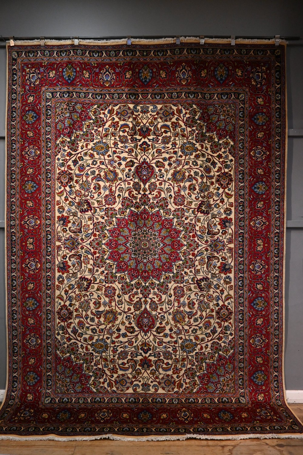 A BEAUTIFUL PERSIAN KASHMAR CARPET. 100% FINE WOOL PILE. DENSELY HAND-KNOTTED WITH CLASSIC & UNIQUE KASHMAR DESIGN OF SUNBURST ELONGATED FLORAL MEDALLION WITH QUARTERED CORNER MEDALLIONS ON A CREAM FIELD OF SHAH ABBASI PALMETTES, ESLIMI SCROLLS & TENDRILS. BORDER OF FLORAL SPRAYS, PALMETTES IN FRENCH BLUE & TENDRILS IN A RICH ROYAL CRIMSON FIELD. SOLID & HARDWEARING. SIZE: 358 X 250 CM ORIGIN: IRAN - RRP: $9,900 DOCUMENTATION OF AUTHENTICITY INCLUDED