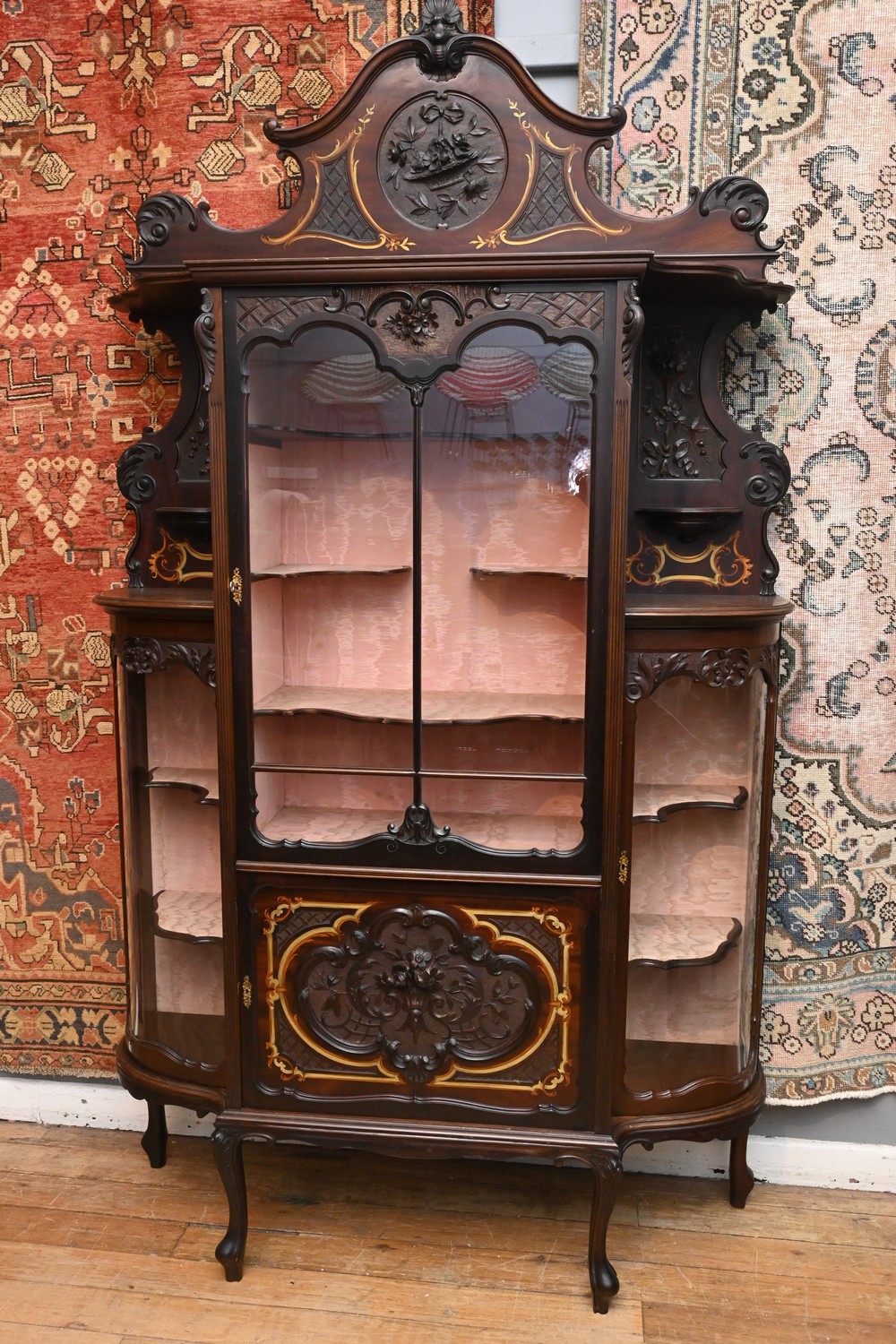 A LATE VICTORIAN STAINED MAHOGANY AND BRASS-INLAID DISPLAY CABINET (A/F) (KEY IN OFFICE) (H250 X W136 X D40 CM) (PLEASE NOTE THIS HEAVY ITEM MUST BE REMOVED BY CLIENTS OR CARRIERS AT THE CUSTOMERS EXPENSE. LEONARD JOEL STAFF CANNOT ASSIST CARRYING THIS ITEM)