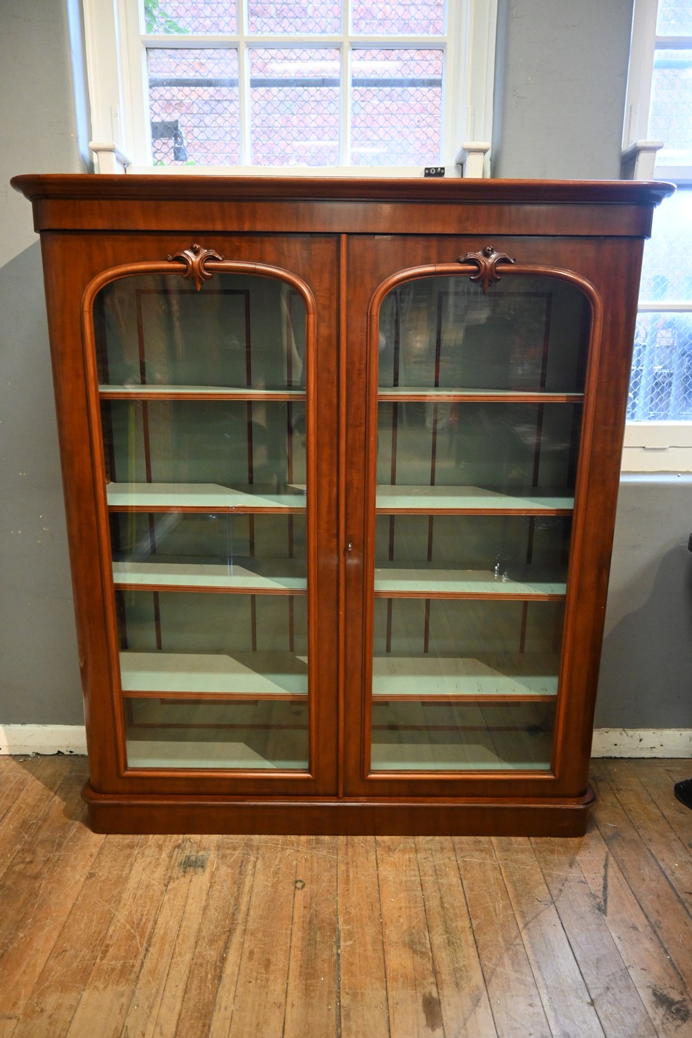 A VICTORIAN MAHOGANY TWO DOOR BOOKCASE (171H X 146W X 40D CM) (KEY IN OFFICE) (PLEASE NOTE THIS HEAVY ITEM MUST BE REMOVED BY CLIENTS OR CARRIERS AT THE CUSTOMERS EXPENSE. LEONARD JOEL STAFF CANNOT ASSIST CARRYING THIS ITEM)