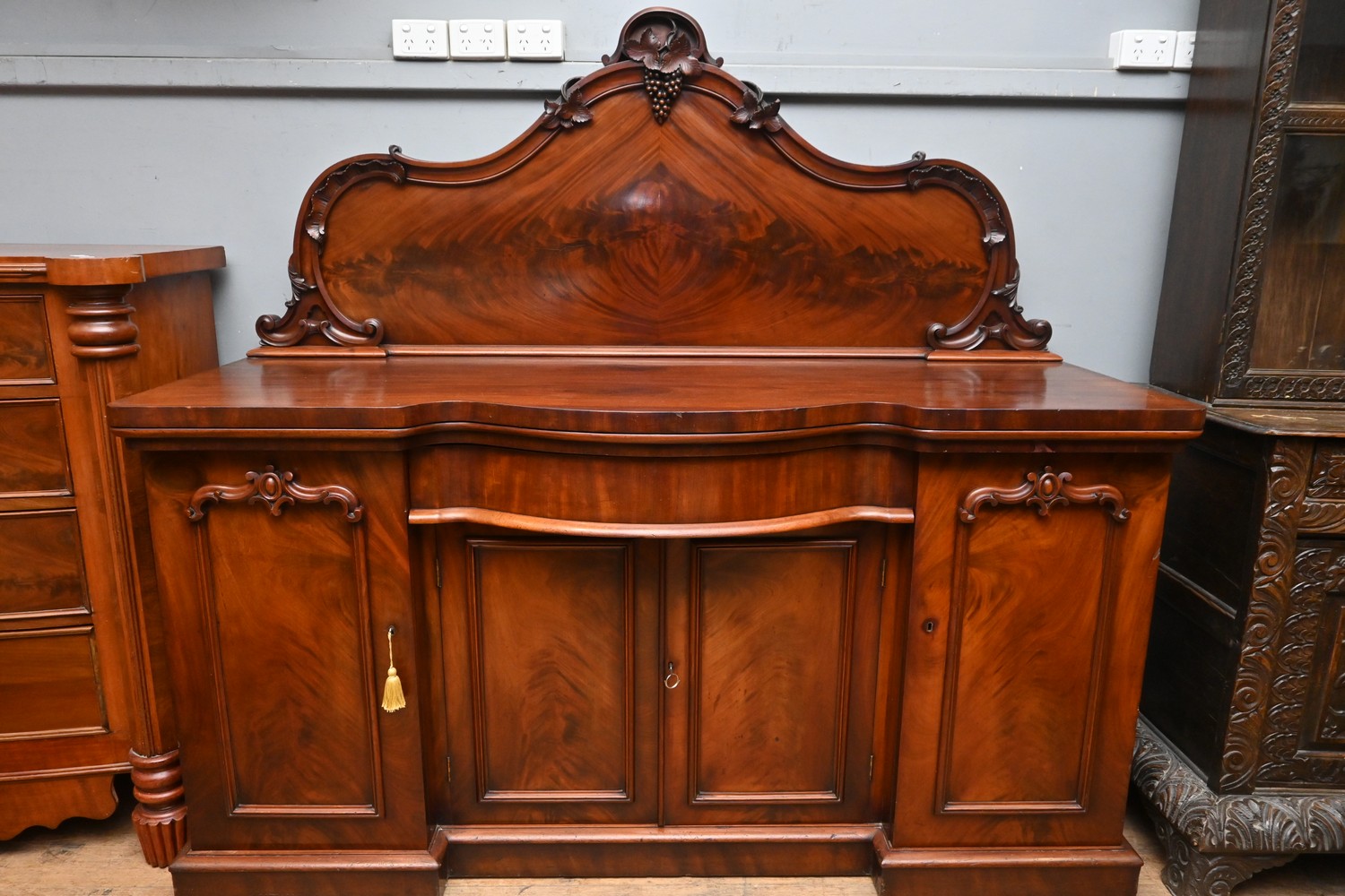 A VICTORIAN MAHOGANY BREAKFRONT SIDEBOARD (H180 X W182 X D65 CM) (KEY IN OFFICE) (PLEASE NOTE THIS HEAVY ITEM MUST BE REMOVED BY CLIENTS OR CARRIERS AT THE CUSTOMERS EXPENSE. LEONARD JOEL STAFF CANNOT ASSIST CARRYING THIS ITEM)