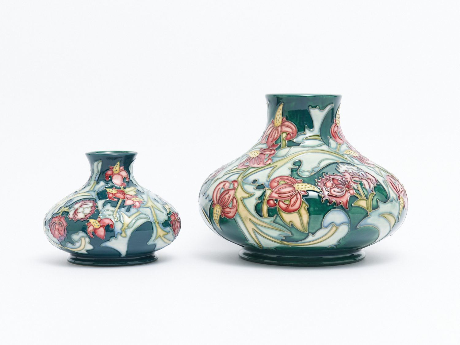 TWO MOORCROFT "LEICESTER" VASES, H.17CM AND 11CM, LEONARD JOEL LOCAL DELIVERY: SMALL
