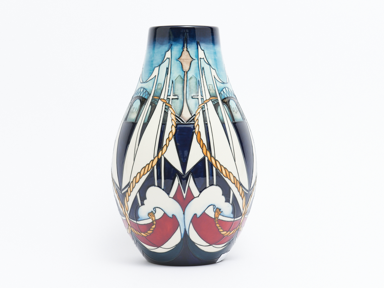 A MOORCROFT "CITY OF SAILS" (AUCKLAND) VASE DESIGNED BY VICKY LOVATT, DATED 2013, NUMBERED 16/75, NEW ZEALAND STAMP, H.26CM, LEONARD JOEL LOCAL DELIVERY: MEDIUM