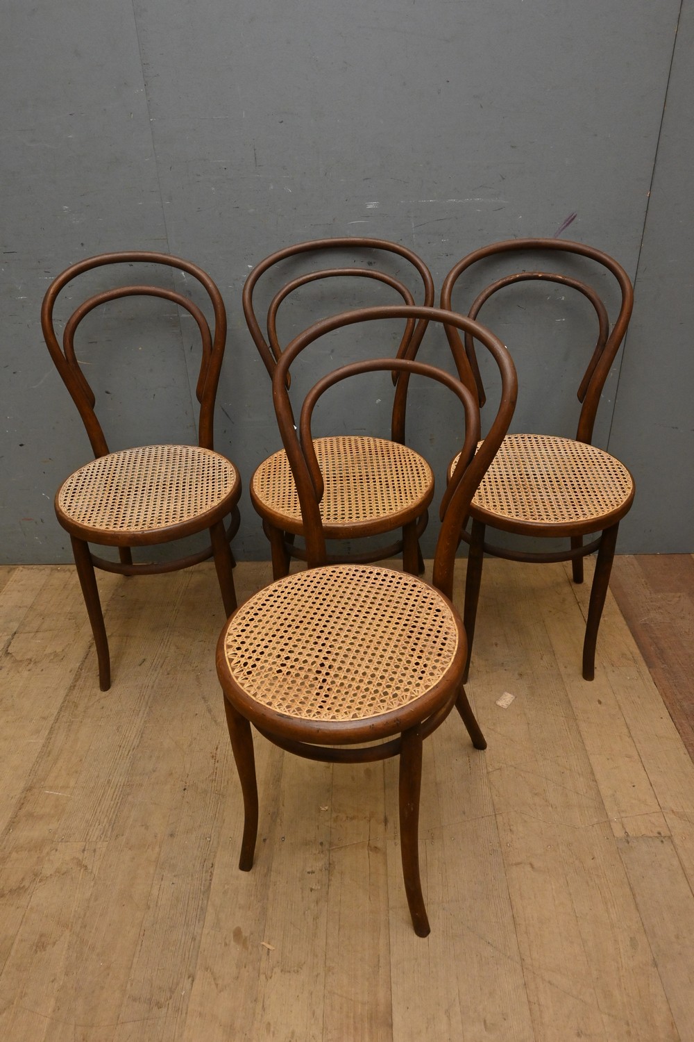 A SET OF FOUR BENTWOOD & RATTAN DINING CHAIRS - EVIDENCE OF TREATED BORER (A/F) (91H X 44W X 56D CM) (LEONARD JOEL DELIVERY SIZE: LARGE)