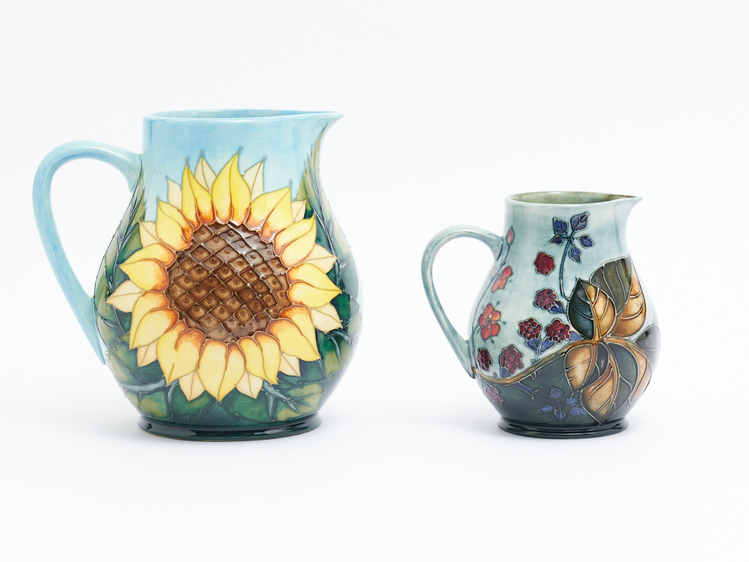 A MOORCROFT "SUNFLOWER" JUG TOGETHER WITH "BRAMBLE" JUG, H.19CM AND 16CM, LEONARD JOEL LOCAL DELIVERY: MEDIUM