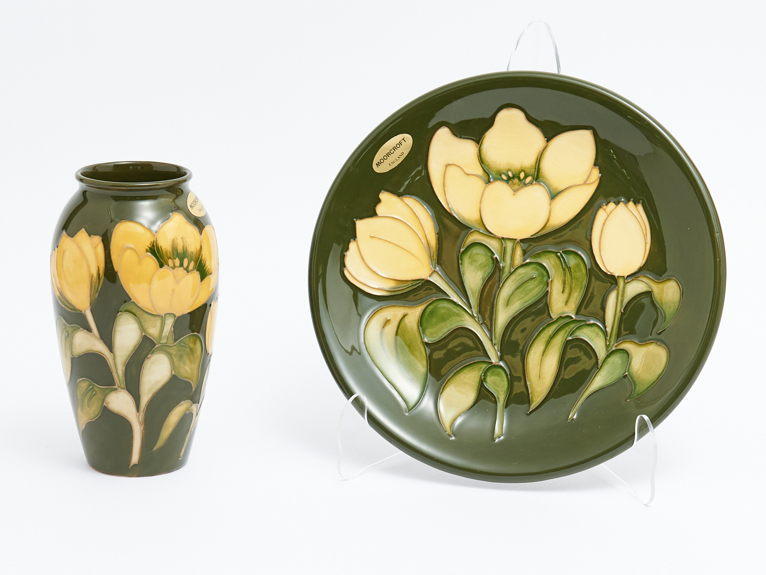A MOORCROFT TULIP PATTERN VASE AND PLATE H.26CM (LARGEST), LEONARD JOEL LOCAL DELIVERY: SMALL