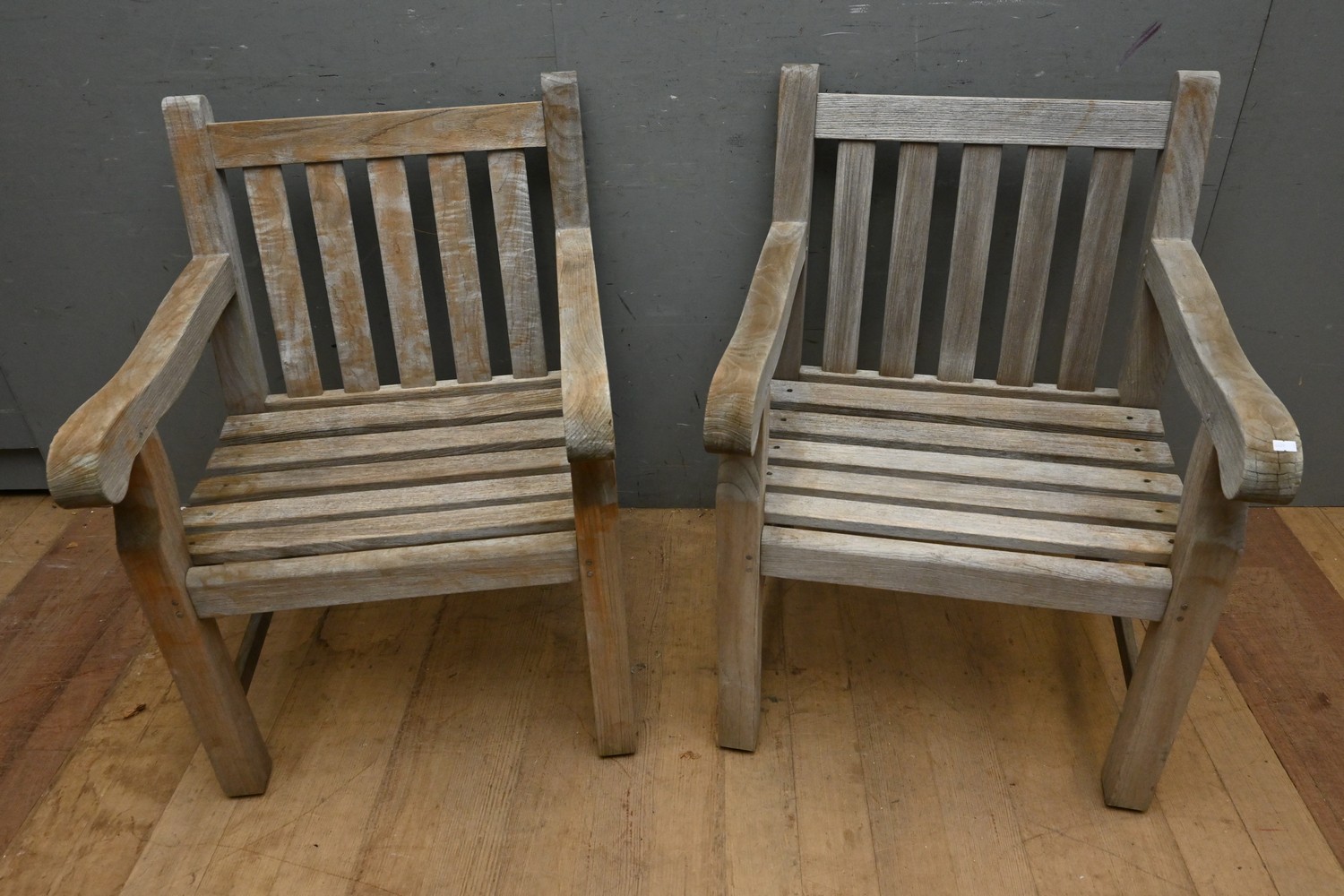 A PAIR OF JATI TEAK OUTDOOR ARMCHAIRS (89H X 64W X 70D CM) (LEONARD JOEL DELIVERY SIZE: X-LARGE)