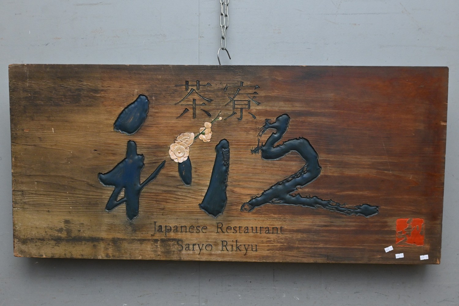 A JAPANESE HAND CARVED WOOD RESTAURANT SIGN, SARYO RIKYU (55H X 120W CM) (LEONARD JOEL DELIVERY SIZE: LARGE)